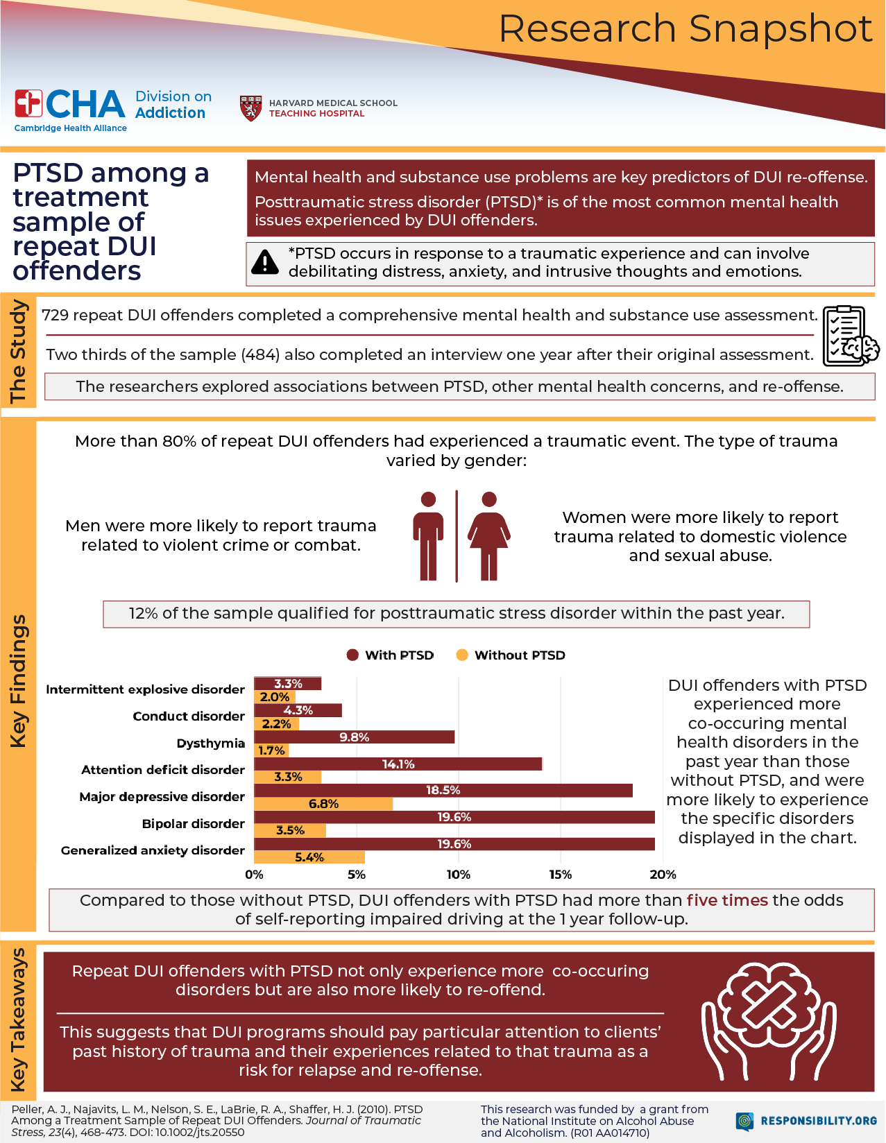 - PTSD among a Treatment Sample of Repeat DUI Offenders – This snapshot provides an overview of a study examining posttraumatic stress disorder among offenders arrested more than once for DUI.